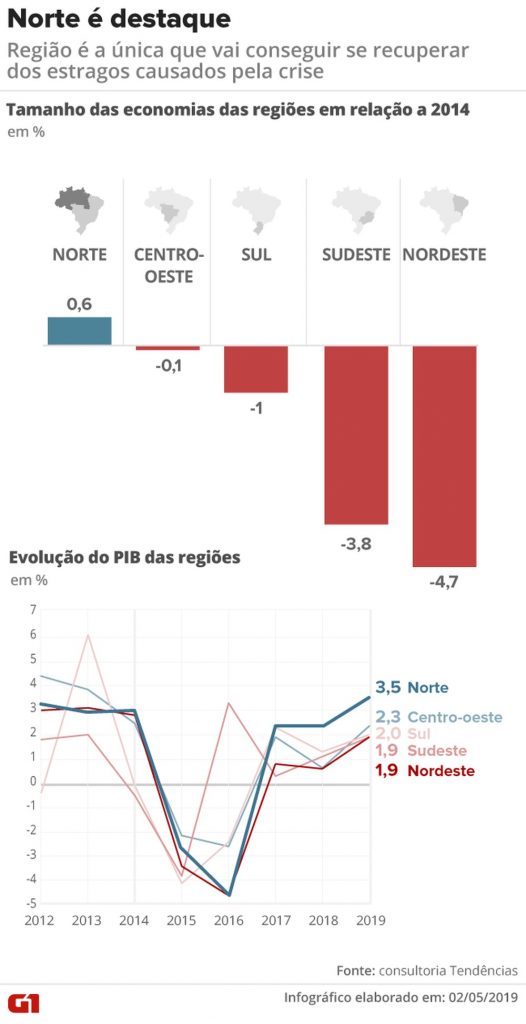 O Norte deve ser a única região que conseguirá, ainda este ano, superar de vez os estragos provocados pela crise. Ao fim de 2019, o Produto Interno Bruto (PIB) da região estará 0,6% maior do que o observado em 2014, último ano em que a economia do Brasil cresceu antes do começo do período recessivo.