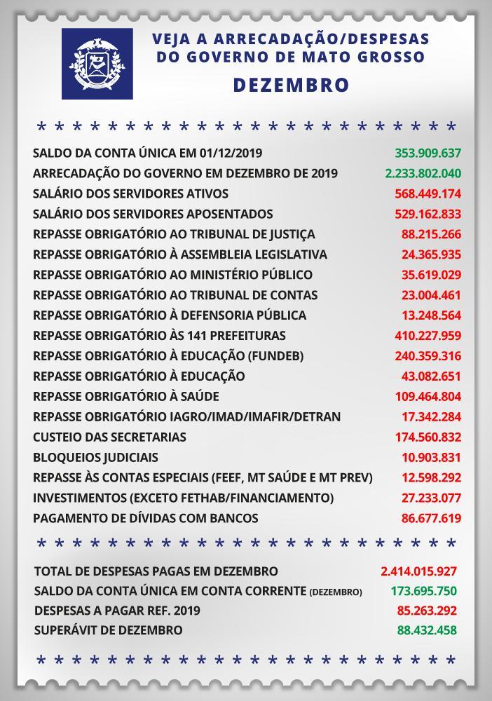 O governo do Estado de Mato Grosso fechou o mês de dezembro de 2019 com um superávit de R$ 88,432.458 milhões, resultado de uma arrecadação de pouco mais de R$ 2,2 bilhões dentro do período. O valor é a somatória de tudo que foi arrecadado, considerando o que foi pago no mês.