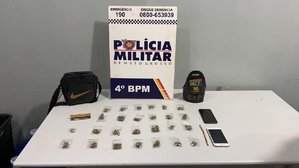 Crédito de imagem: Na ação, a PM apreendeu 25 porções de maconha. – Foto por: PMMT