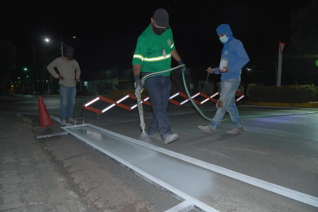 Uma equipe da Secretaria Municipal de Segurança e Trânsito atua no período noturno revitalizando a sinalização viária e faixa de pedestre. A ação tem como objetivo acelerar o trabalho e minimizar os impactos no trânsito luverdense.
