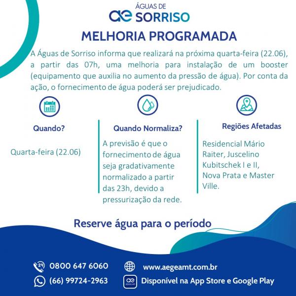 A Águas de Sorriso informa que, realizará na próxima quarta-feira (22.06), a partir das 07h, uma melhoria para instalação de um booster (equipamento que auxilia no aumento da pressão de água). Por conta da ação, o fornecimento de água poderá ser prejudicado no Residencial Mário Raiter, Juscelino Kubitschek I e II, Nova Prata e Master Ville.