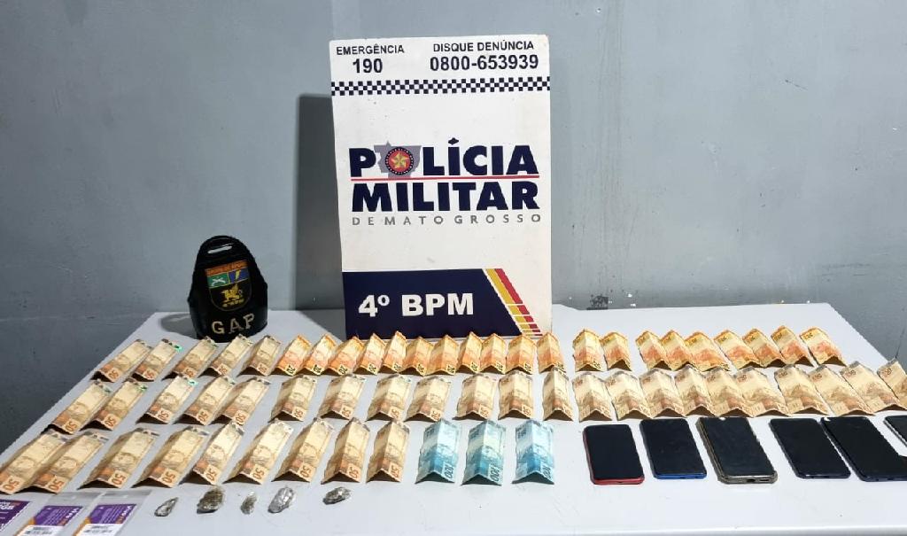 Quatro homens foram presos por policiais militares do 4º Batalhão na noite desta quarta-feira (06.07), por tráfico de entorpecentes e estelionato, por meio de golpes de aplicativo, no bairro Jardim Manaia, em Várzea Grande. Ao todo, foram apreendidos quatro porções de substância análoga à maconha, cinco aparelhos celulares, cinco chips e R$ 2.500 em espécie.
