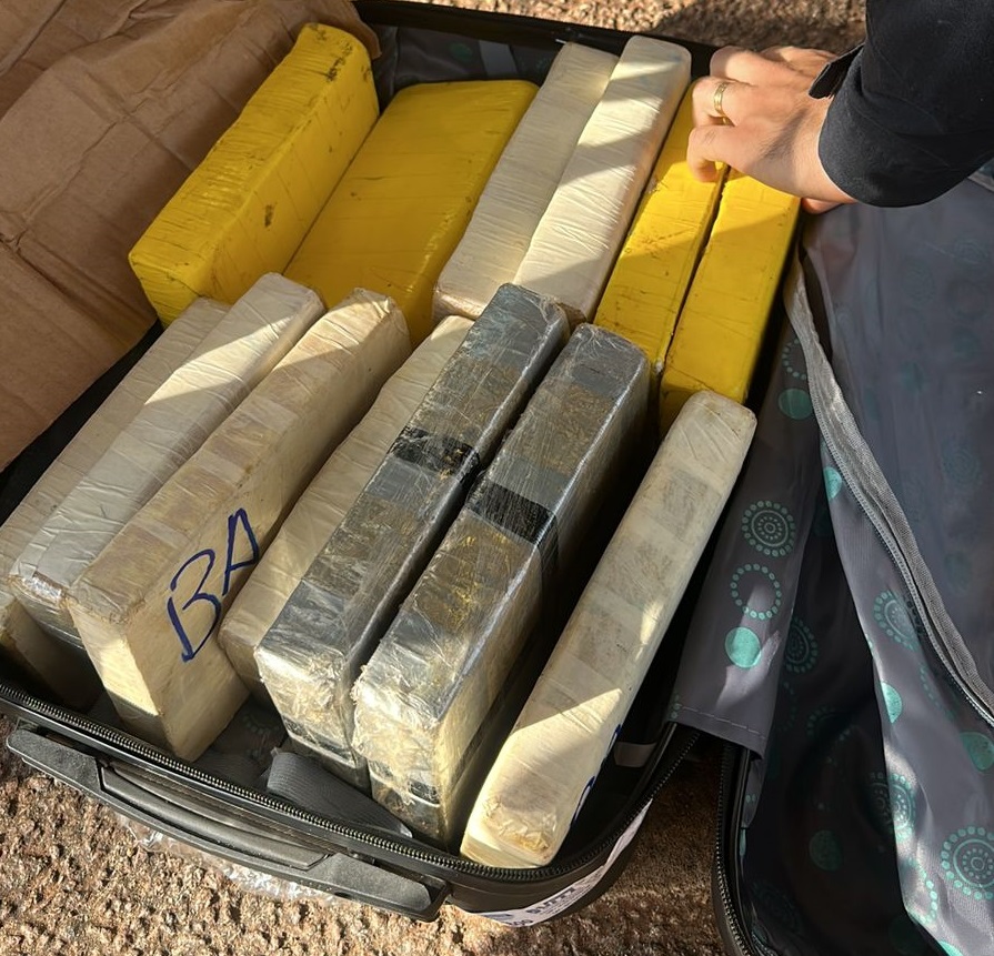 Com a ajuda do cão farejador, foi detectada a presença de entorpecente em uma mala e em um mochila que estavam no bagageiro, na parte inferior do veículo. Ao abrir as bagagens, os policiais encontraram 17 tabletes de pasta base de cocaína, além de cocaína em pó.