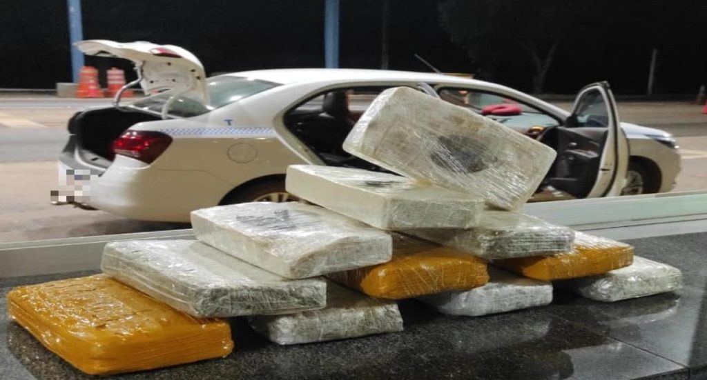 Os agentes do Canil Integrado de Fronteira (Canilfron) abordaram o veículo ocupado pelo motorista e passageiro no posto da PRF, na BR-070. Com auxílio dos cães farejadores, os policiais encontraram três tabletes de substância análoga a pasta base de cocaína e oito de substância análoga a maconha nas bolsas do passageiro.