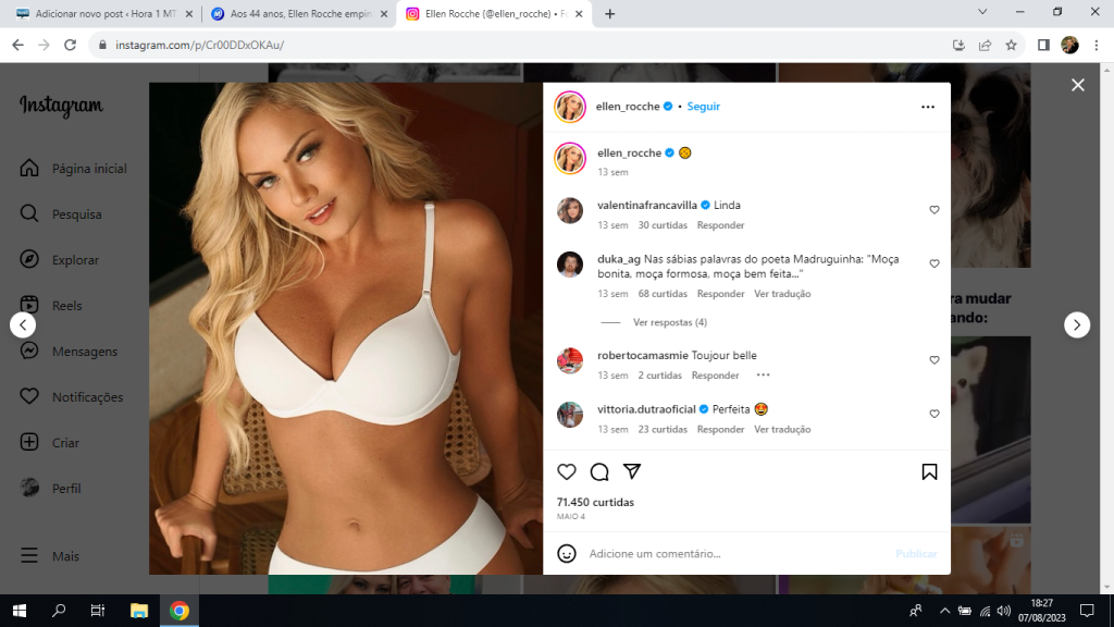 “Dia lindo por aqui! Dando uma relaxada porque daqui a pouco tem ‘Quem Vai Ficar com Juca?’no teatro Regina Vogue, as 21:00 hs. Alô Curitiba! Espero você”, escreveu na legenda da publicação. Na foto, Ellen Rocche apareceu com um biquíni branco, enquanto empina o seu bumbum.