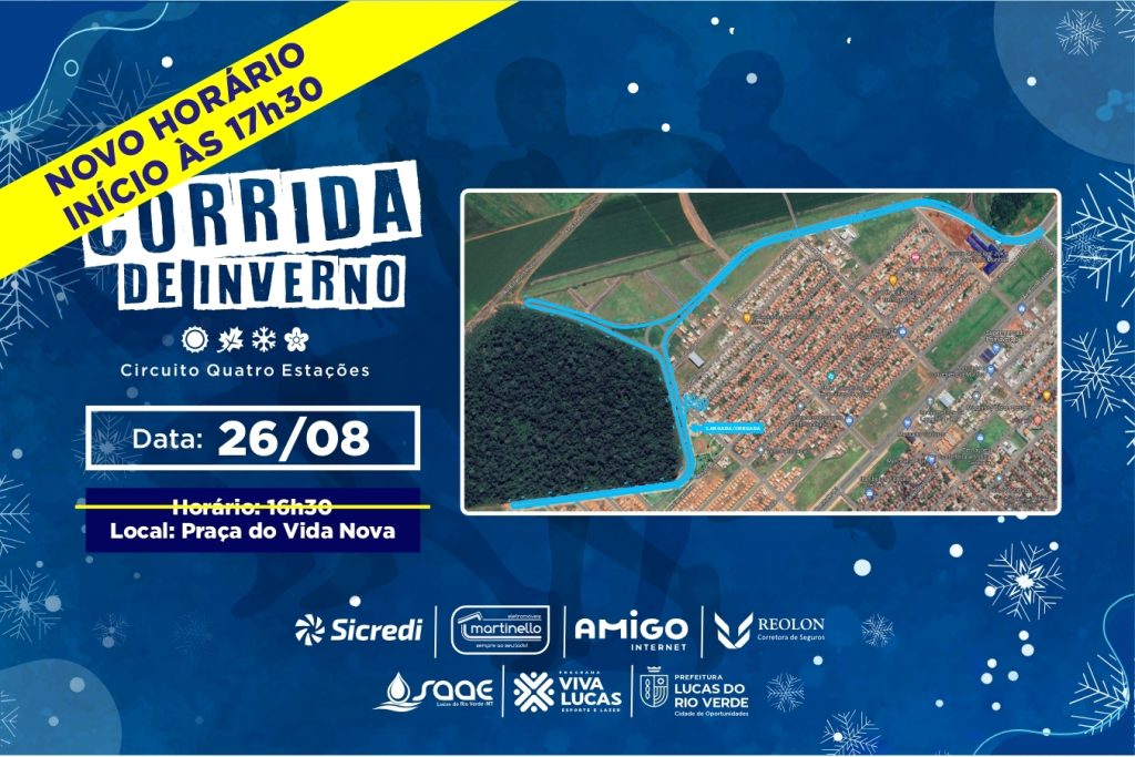A Secretaria de Esporte e Lazer, divulgou na manhã desta quarta-feira (16), o novo horário da Corrida de Inverno, que faz parte da 3ª etapa do Circuito Municipal Quatro Estações, realizada em Lucas do Rio Verde. Agora, a prova será realizada às 17h30.