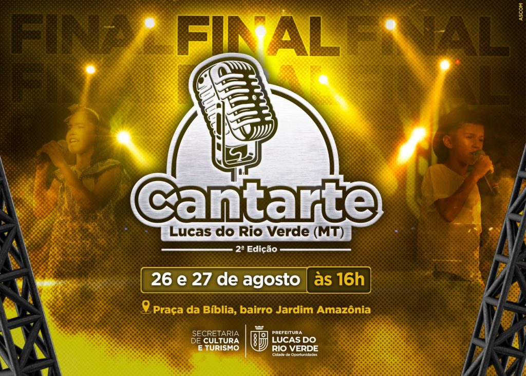 A Secretaria de Cultura e Turismo de Lucas do Rio Verde, convida a comunidade para prestigiar a grande final da 2ª edição do Concurso de Canto “Cantarte”. O evento será realizado nos dias 26 e 27 de agosto, a partir das 16h, na Concha Acústica do município, que fica na Praça da Bíblia, no bairro Jardim Amazônia.