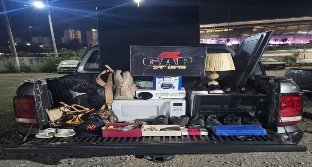Policiais militares do 24º Batalhão prenderam, em flagrante, uma mulher de 23 anos por roubo, na madrugada desta quarta-feira (17.08), no bairro Pedra 90, em Cuiabá. No local, a PM conseguiu localizar objetos, eletrodomésticos e uma caminhonete Amarok, que foram levados no crime.