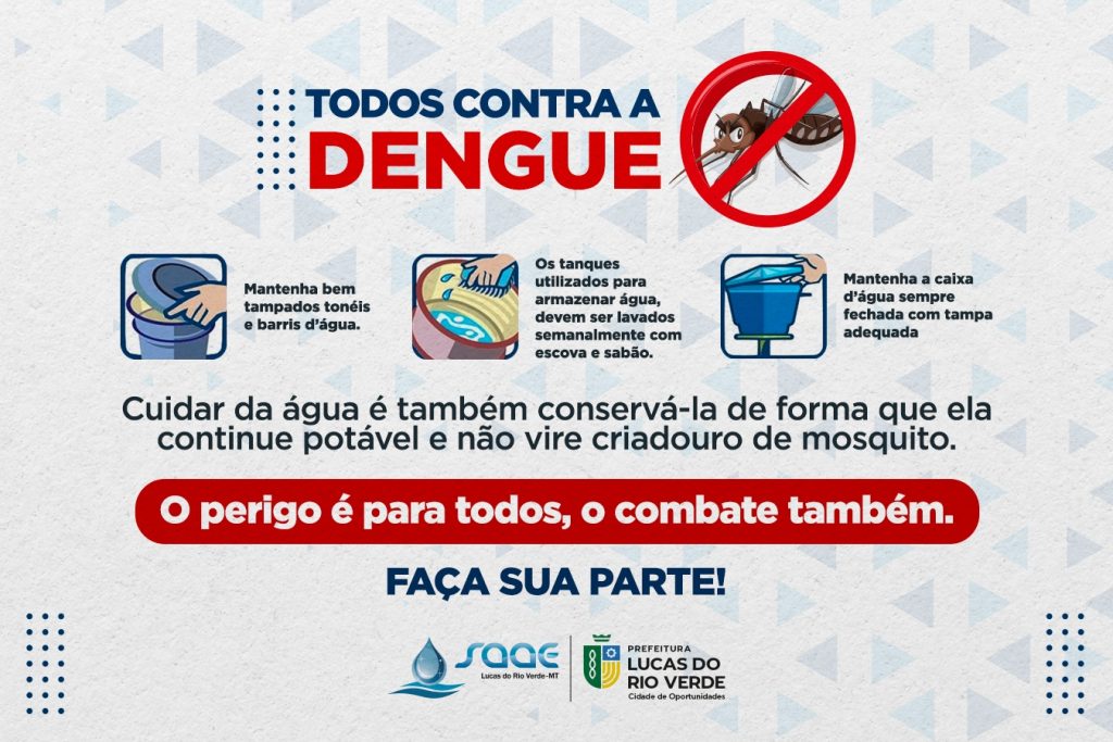 Com a crescente proliferação do mosquito da dengue no município, o Serviço Autônomo de Água e Esgoto (Saae) de Lucas do Rio Verde, vem alertar a população sobre a importância de manterem suas caixas d’água limpas e fechadas para evitar a proliferação do mosquito Aedes aegypti, transmissor da dengue, zika e chikungunya. Dentre as medidas preventivas, está a limpeza e vedação das caixas d’água, que são um dos locais para a antecipação do mosquito.