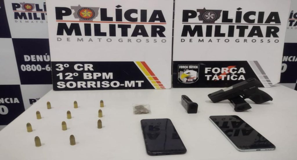 Policiais militares da Força Tática do 12º Batalhão prenderam nesta quinta-feira (21.09) o integrante de organização criminosa, de 26 anos, por porte ilegal de arma de fogo e tráfico de drogas, no Bairro Parque Universitário, em Sorriso (397 km de Cuiabá).
