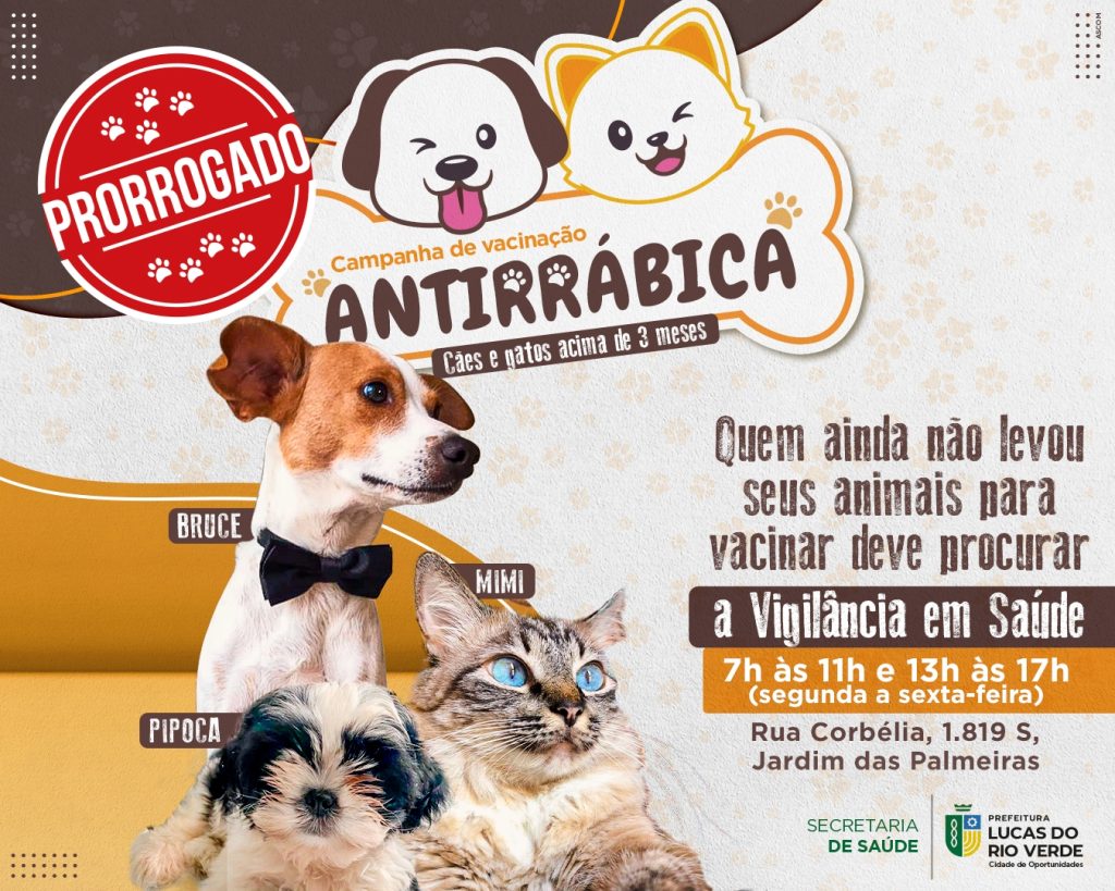 Para quem ainda não levou seu cão e/ou gato para vacinar contra a raiva, a Prefeitura de Lucas do Rio Verde anuncia que a imunização antirrábica foi prorrogada. Os interessados devem procurar a Vigilância em Saúde, de segunda a sexta-feira, das 7h às 11h e das 13h às 17h.