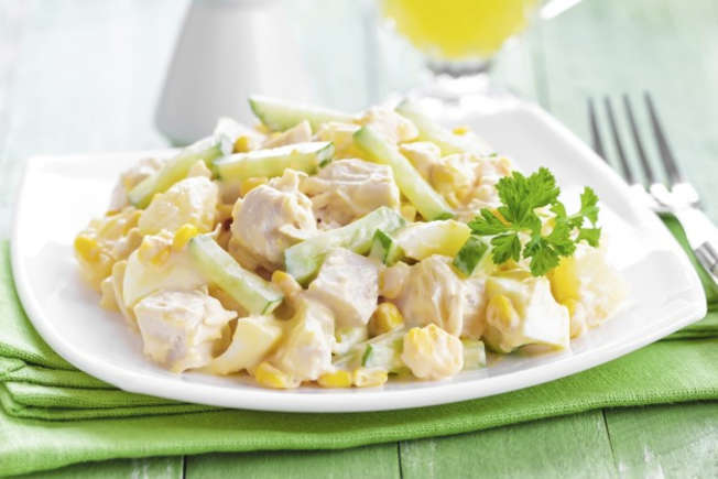 Coloque 300 g de batatas cozidas em cubos em sua saladeira, o frango frio, adicione 1/2 lata de milho, 1/2 pepino cortado em palitos e maionese. Sirva bem gelado.