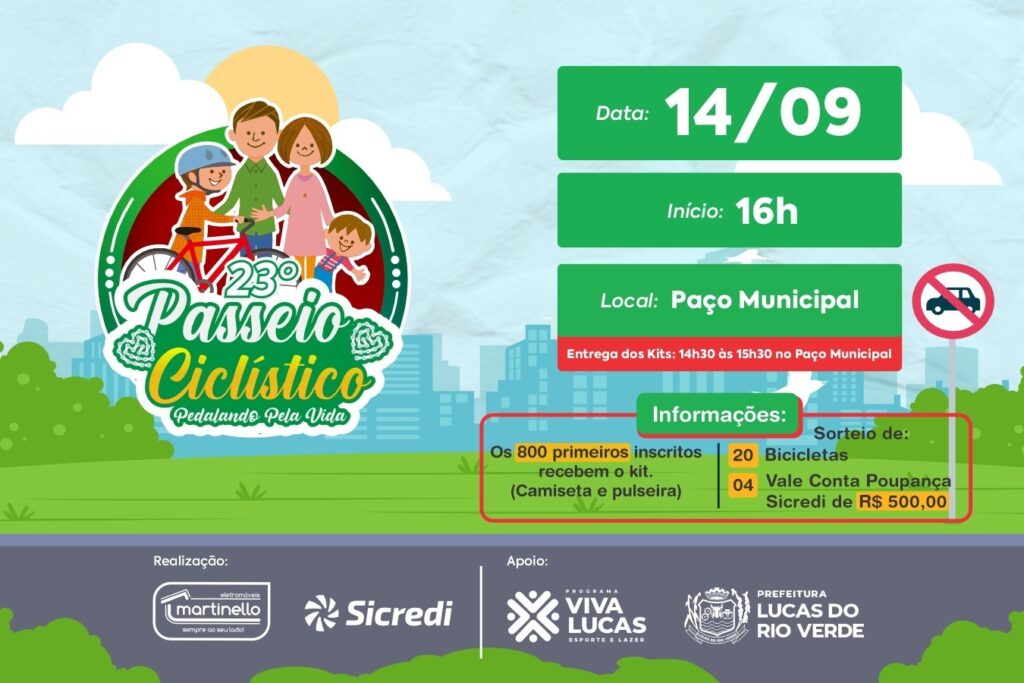 Mais uma oportunidade de colocar as atividades físicas em dia com o 23º Passeio Ciclístico “Pedalando pela Vida”. O evento será realizado neste sábado (14), às 16h, com largada do Paço Municipal. A iniciativa conta com apoio da Prefeitura de Lucas do Rio Verde, por meio da Secretaria de Esporte e Lazer.
