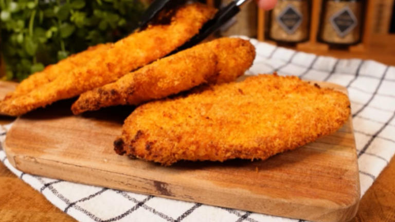 - Aos poucos, passe o frango temperado na farinha panko, garantindo que esteja bem envolvido dos dois lados