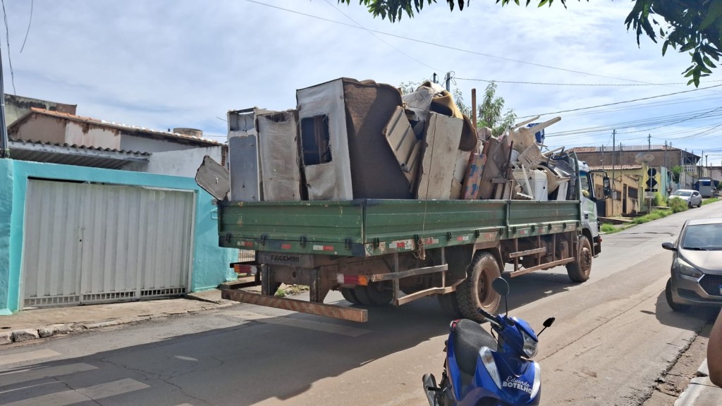 A foto mostra um caminhão carregado com entulho retirado durante o mutirão de limpeza.