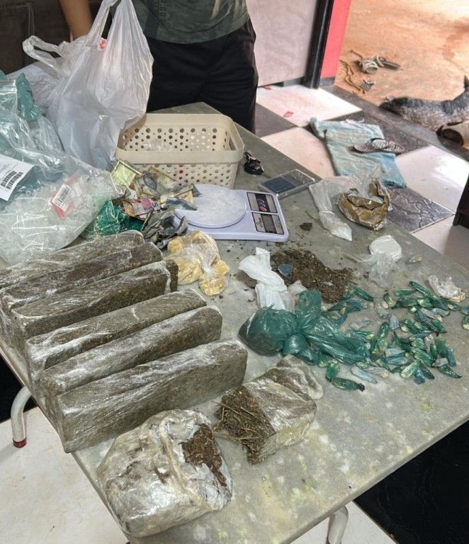Na ação foram apreendidos 74 comprimidos de ecstasy, cerca de 100 porções de pasta base e de cocaína, sete tabletes de maconha, porções da mesma substância, pacote com diversos pinos para acondicionar o entorpecente, dinheiro, balanças de precisão, celulares e outros materiais.