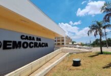#DescriçãodaImagem: A imagem mostra a fachada da Casa da Democracia, um prédio com detalhes nas cores branca e alaranjada, com a identificação escrita na frente. No canto superior direito, está escrito, dentro de uma caixa de diálogo pontilhada, o texto “regularize o título”.