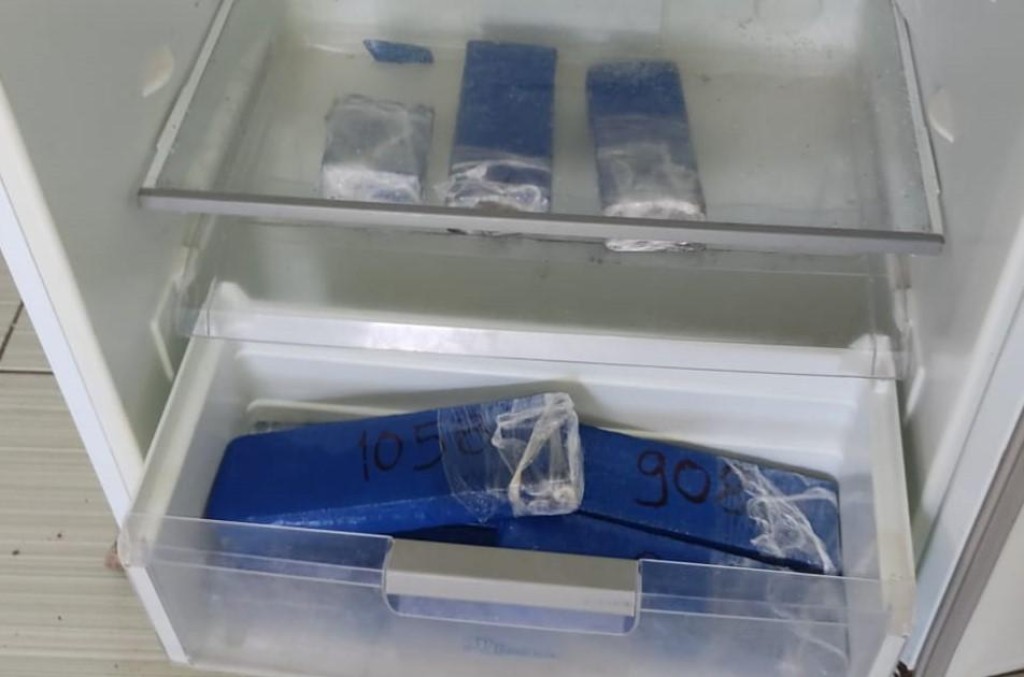 A equipe entrou no local e encontrou, dentro da geladeira, 7,5kg de maconha. Também foi localizado um caderno com anotações de venda de drogas, documentos, dois relógios, plástico filme, utilizado para embalar droga, dois celulares, duas balanças de precisão e uma máquina de passar cartão.