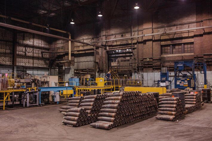Projéteis de artilharia de fabricação americana são preparados em uma fábrica em Scranton, Pensilvânia, antes de serem enviados à Ucrânia Foto: Natalie Keyssar/The New York Times