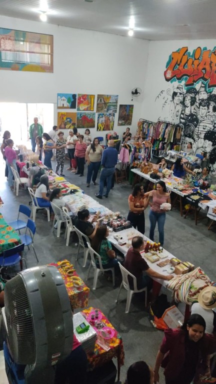 A foto mostra o espaço com as mesas dos expositores e visitantes, registrada em uma das edições realizadas no local.
