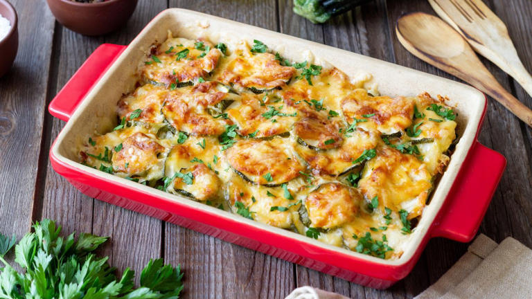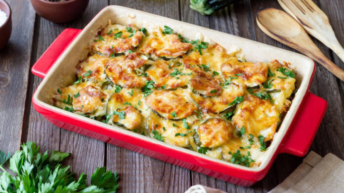 - Para a montagem, em um refratário médio untado, faça camadas de abobrinha com cebola e de queijo.