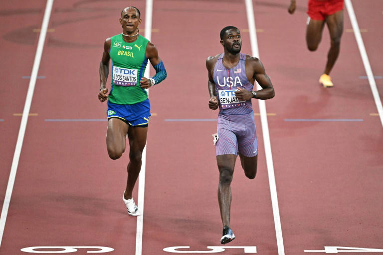 Rai Benjamin (à direita) vence a semifinal dos 400 m com barreiras no Mundial de Atletismo em Tóquio, à frente de Alison Dos Santos (à esquerda), em 17 de setembro de 2025 © Philip FONG