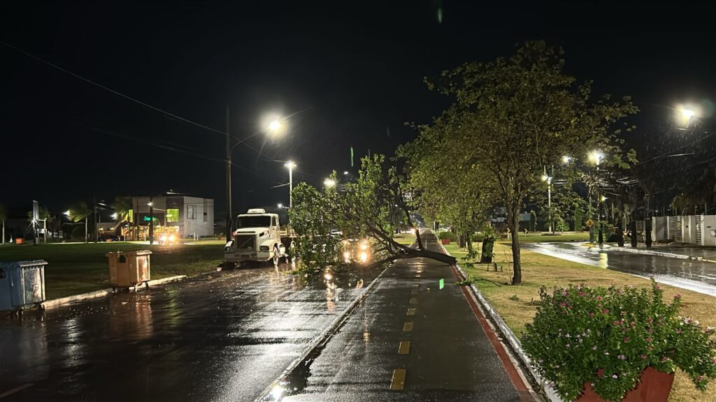 Na noite desta quarta-feira (24), por volta das 19h30, uma árvore caiu na Avenida das Hortênsias, no bairro Bandeirantes, em Lucas do Rio Verde. O incidente ocorreu em razão das chuvas acompanhadas de fortes ventos que atingiram a cidade.
