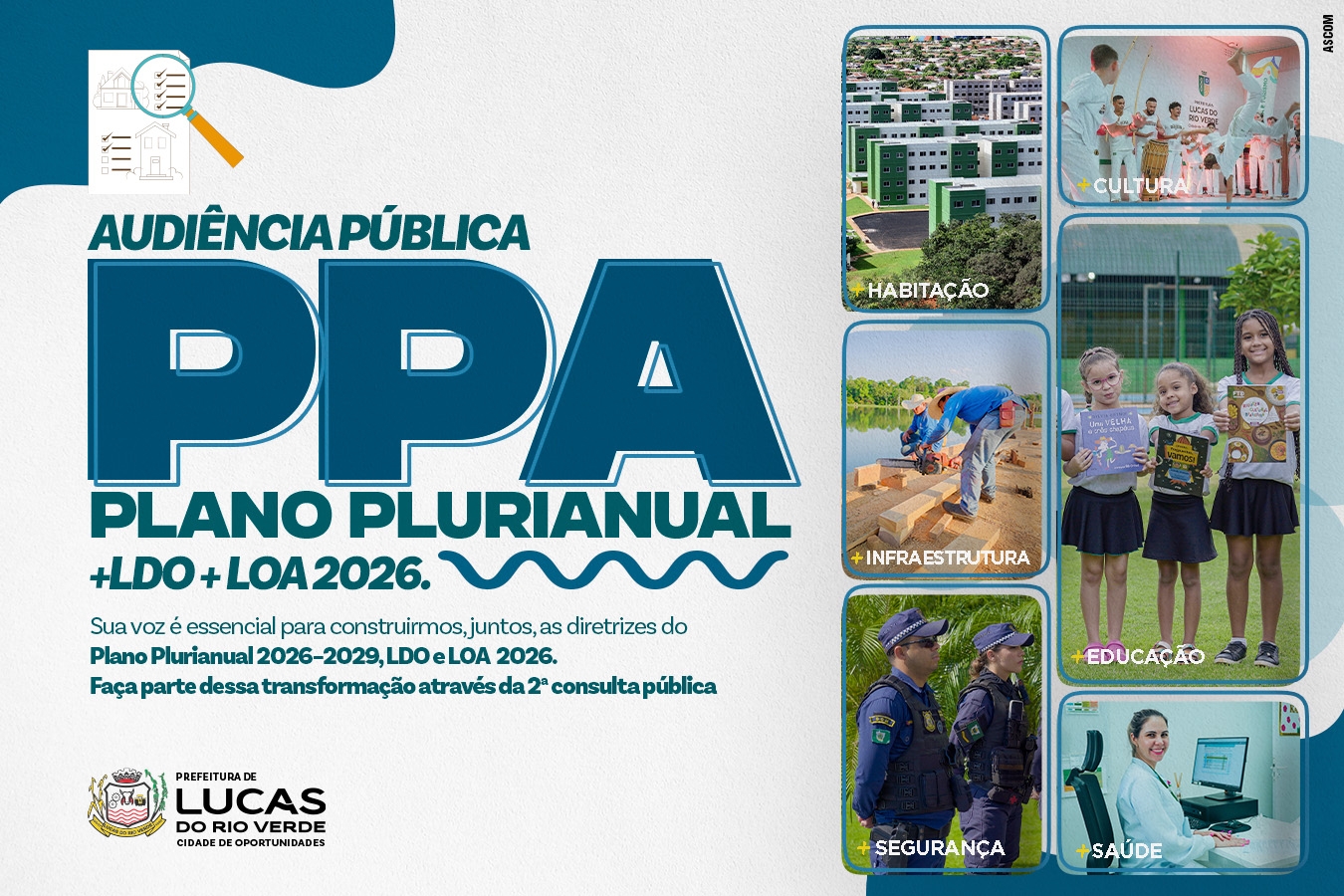 A Prefeitura de Lucas do Rio Verde convida a população para a audiência pública da 2ª Consulta Pública do Plano Plurianual (PPA) 2026–2029, além da Lei de Diretrizes Orçamentárias (LDO) e da Lei Orçamentária Anual (LOA) 2026. O objetivo é ouvir a sociedade sobre suas necessidades e prioridades para os próximos anos, fortalecendo a participação cidadã na construção de políticas públicas.