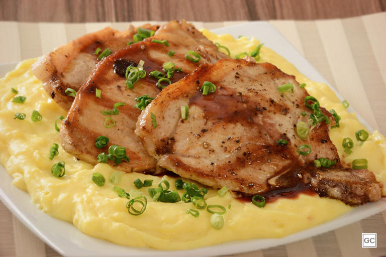4. Leve uma panela ao fogo médio com os ingredientes do purê, mexendo até ficar cremoso e homogêneo. Em uma travessa, espalhe o purê e arrume as bistecas por cima. Regue com o molho, polvilhe com cebolinha e sirva em seguida