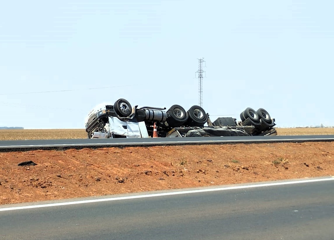 Uma carreta Scania 420, de cor branca, saiu da pista e tombou sobre a faixa de domínio na manhã desta quarta-feira (10), no km 613 da BR-163, em Nova Mutum. O acidente ocorreu por volta das 7h38 e mobilizou equipes de resgate da Nova Rota do Oeste, concessionária responsável pelo trecho.