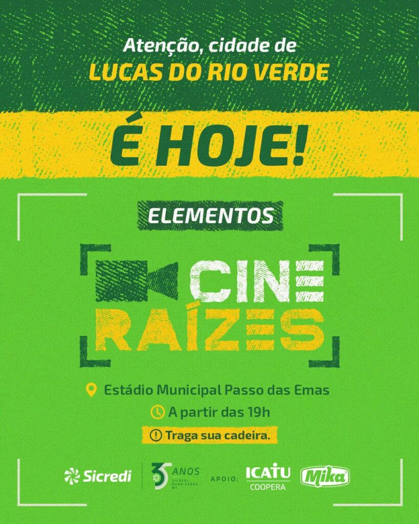 O município de Lucas do Rio Verde será palco do Cine Raízes, iniciativa que transforma praças públicas em salas de cinema a céu aberto. Em Lucas do Rio Verde a sessão será no dia 11 de setembro, a partir das 19h, no Estádio Municipal Passo das Emas, e exibirá o filme Elementos. Os eventos oferecem pipoca e refrigerante para todos, reforçando o clima de diversão e inclusão. A ação faz parte das comemorações dos 35 anos de fundação da cooperativa Sicredi Ouro Verde MT.