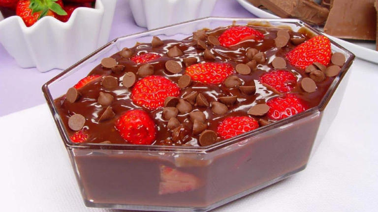 2. Acrescente os morangos e sirva polvilhado com as gotas de chocolate.