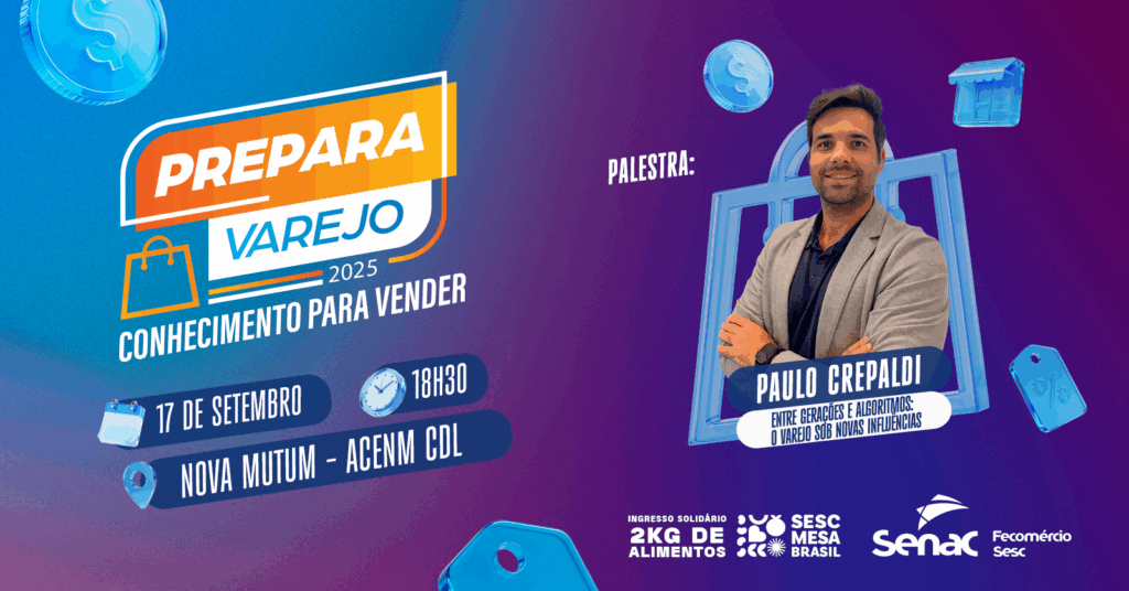 Os eventos contarão com a palestra ‘Entre Gerações e Algoritmos: o varejo sob novas influências’, conduzida por Paulo Crepaldi, empreendedor, fundador da ING Marketing & Training e cofundador da Rocketbase, venture studio que transforma ideias em soluções de healthtech.