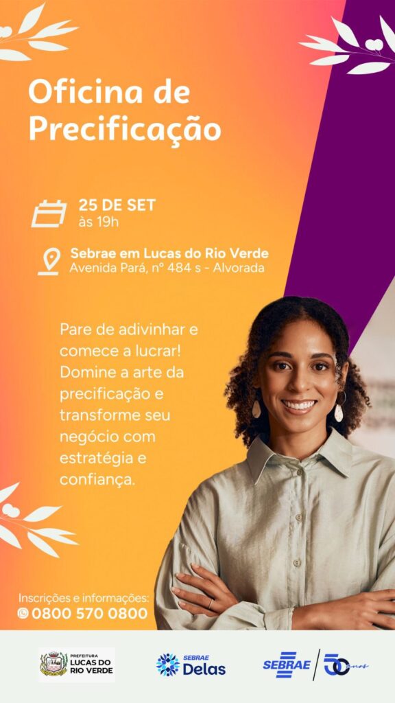 Na próxima quinta-feira (25), às 19h, o Sebrae em parceria com a Prefeitura de Lucas do Rio Verde promove a Oficina de Precificação, voltada exclusivamente para mulheres empreendedoras do município. O evento será realizado na sede do Sebrae, localizada na Avenida Pará, nº 484 S, bairro Alvorada.