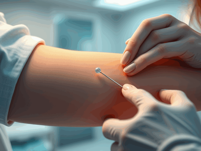 O implante é uma pequena haste flexível inserida sob a pele do braço.