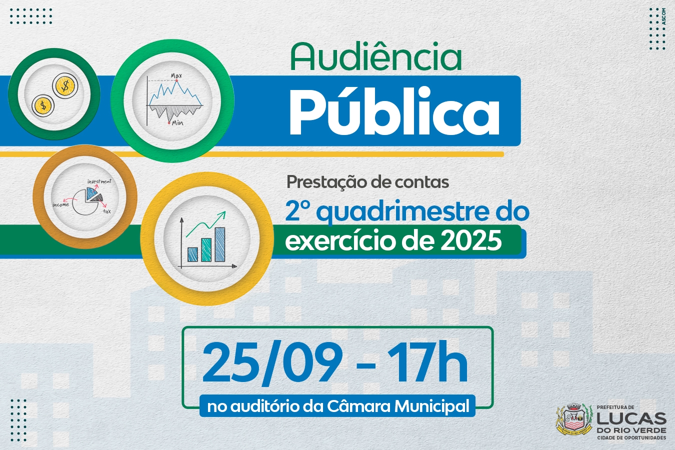 Em conformidade com a Lei de Responsabilidade Fiscal nº 101/2000, a Prefeitura de Lucas do Rio Verde, por meio da Secretaria de Desenvolvimento Econômico, Planejamento e Cidade, realizará uma audiência pública para a prestação de contas do 2º quadrimestre do exercício de 2025. O evento será nesta quinta-feira (25), no auditório da Câmara de Vereadores, com início às 17h, e transmitida, de forma on-line, através do canal do Legislativo Municipal no youtube.