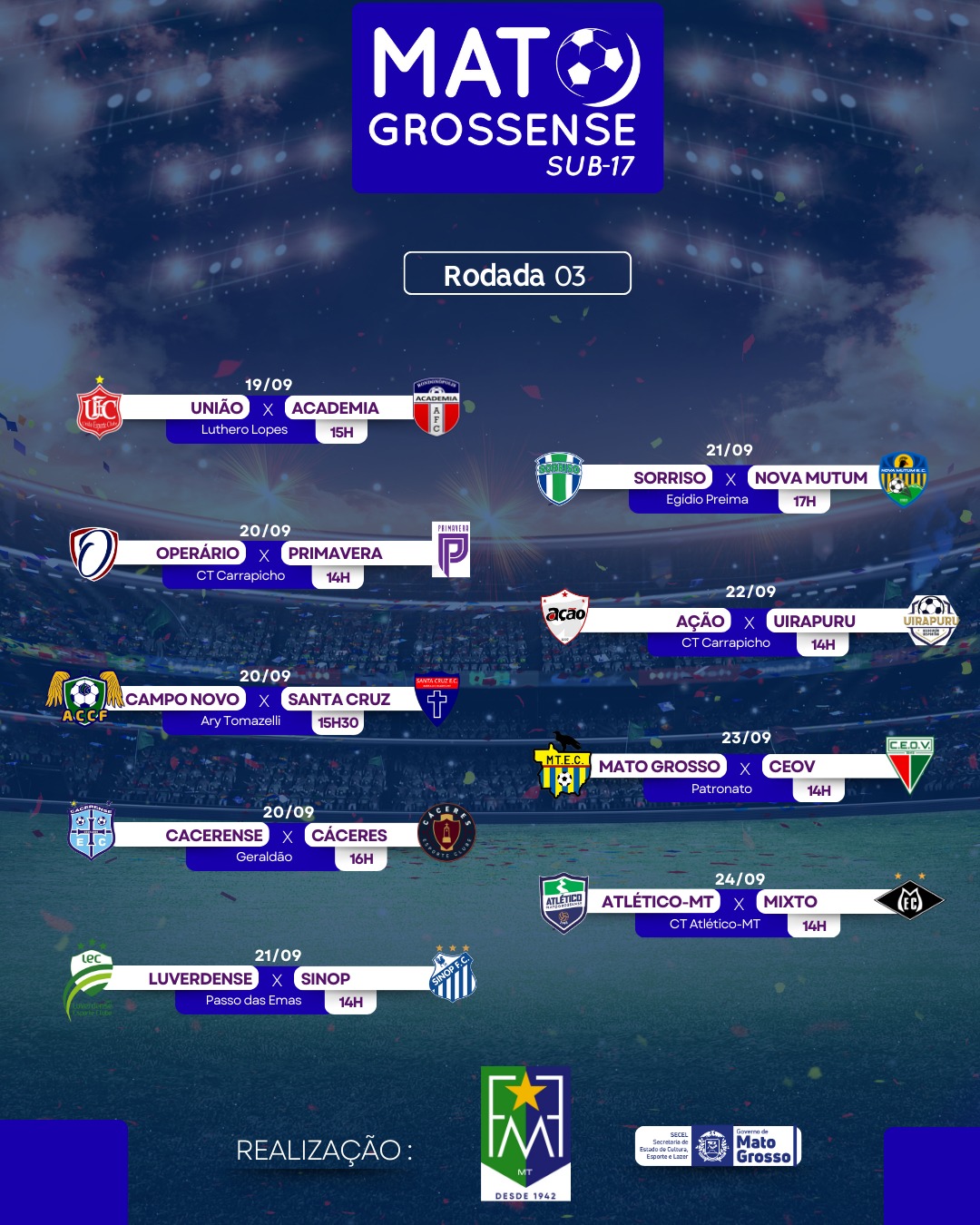 A 3ª rodada do Campeonato Matogrossense Sub-17 2025 começa nesta sexta-feira (19) e segue até a próxima quarta-feira (24). A competição reúne 21 equipes na fase de grupos, dando sequência à formação e revelação de jovens talentos.