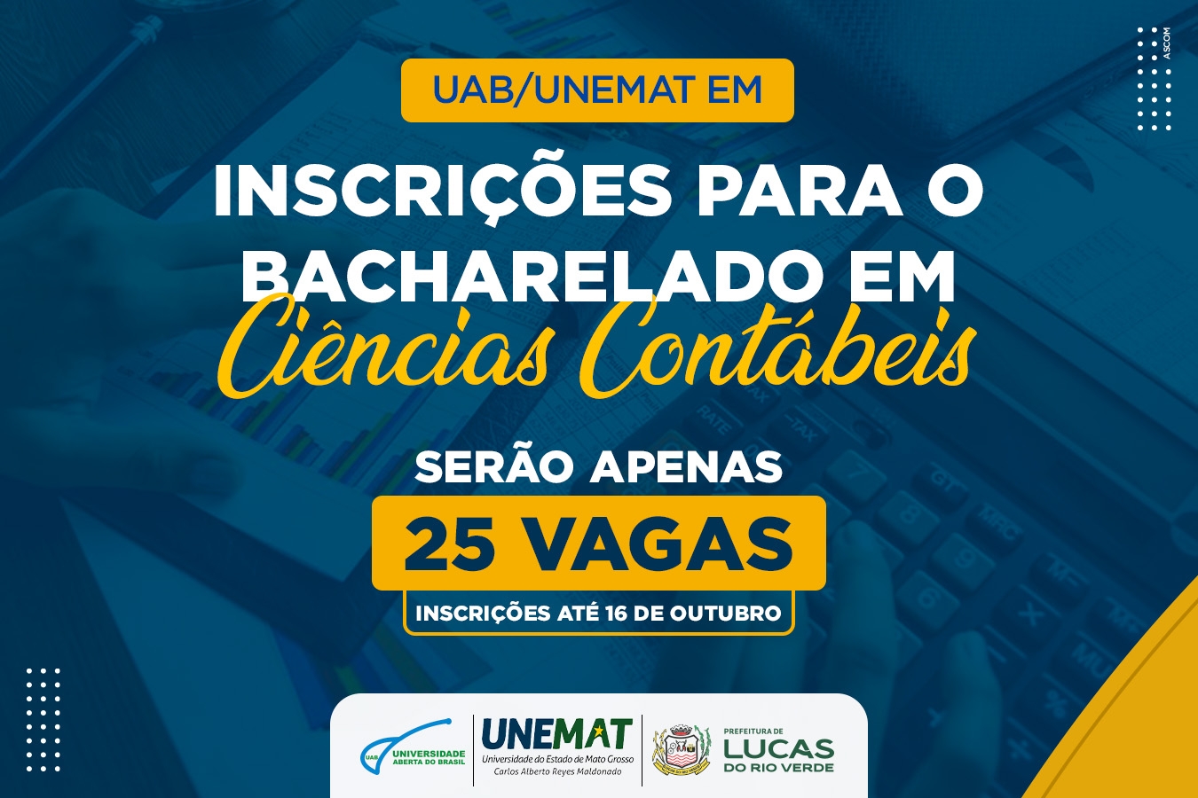 A Universidade Aberta do Brasil (UAB), polo de Lucas do Rio Verde, está com inscrições abertas para o curso Bacharelado em Ciências Contábeis. O curso, ofertado pela Universidade do Estado do Mato Grosso (Unemat), é gratuito e será realizado na modalidade à distância (EaD).