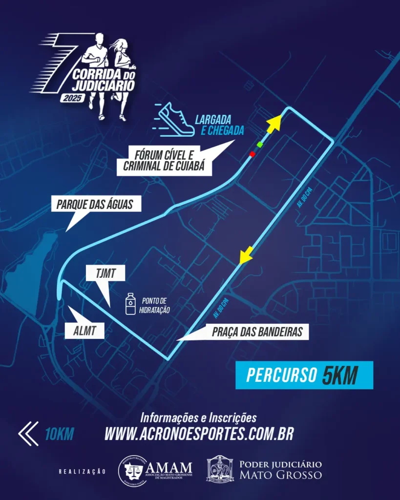 A Comissão Organizadora da 7ª Corrida do Judiciário divulga os percursos que os atletas enfrentarão nas provas de 5 km e 10 km. O evento esportivo será realizado no dia 9 de novembro, com largada e chegada para todas as categorias em frente ao Fórum de Cuiabá, na Avenida Desembargador Milton Figueiredo Ferreira Mendes, no Centro Político Administrativo.