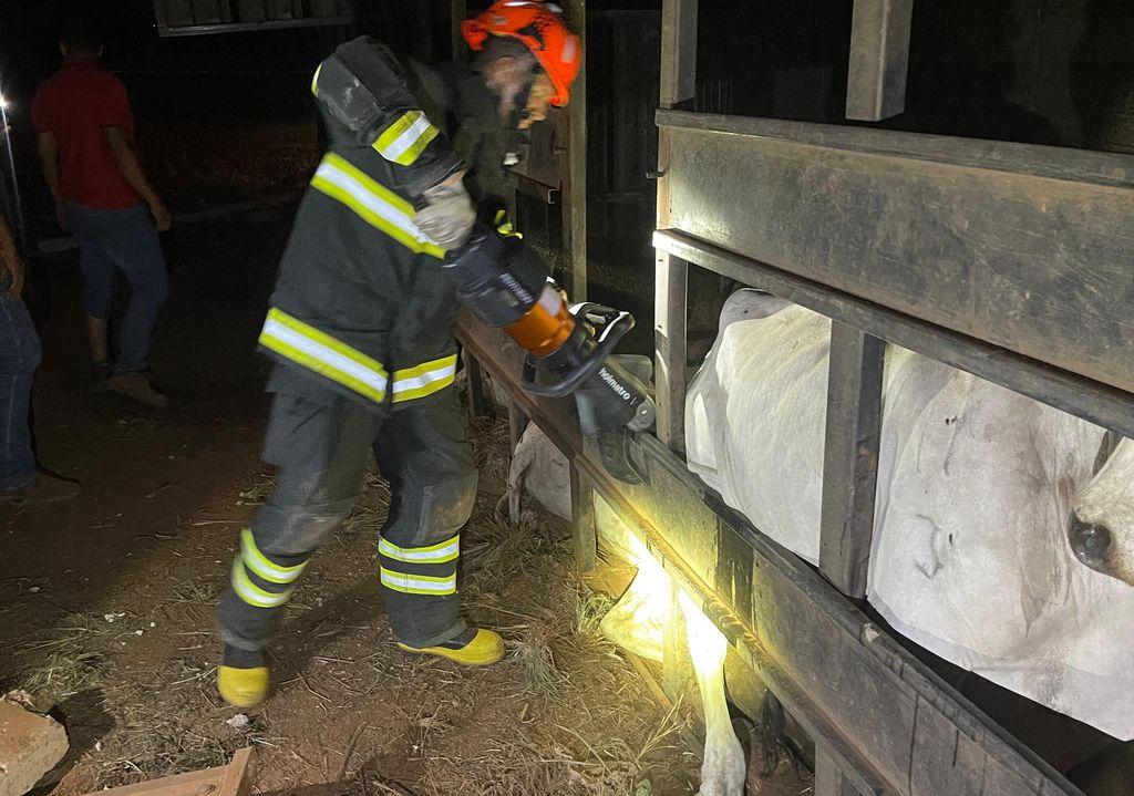 Os bombeiros fizeram cortes estruturais na carroceria, possibilitando a saída e o manejo dos animais. A ação foi realizada em colaboração com os funcionários da fazenda de origem do carregamento, que ficaram responsáveis pelos bois.