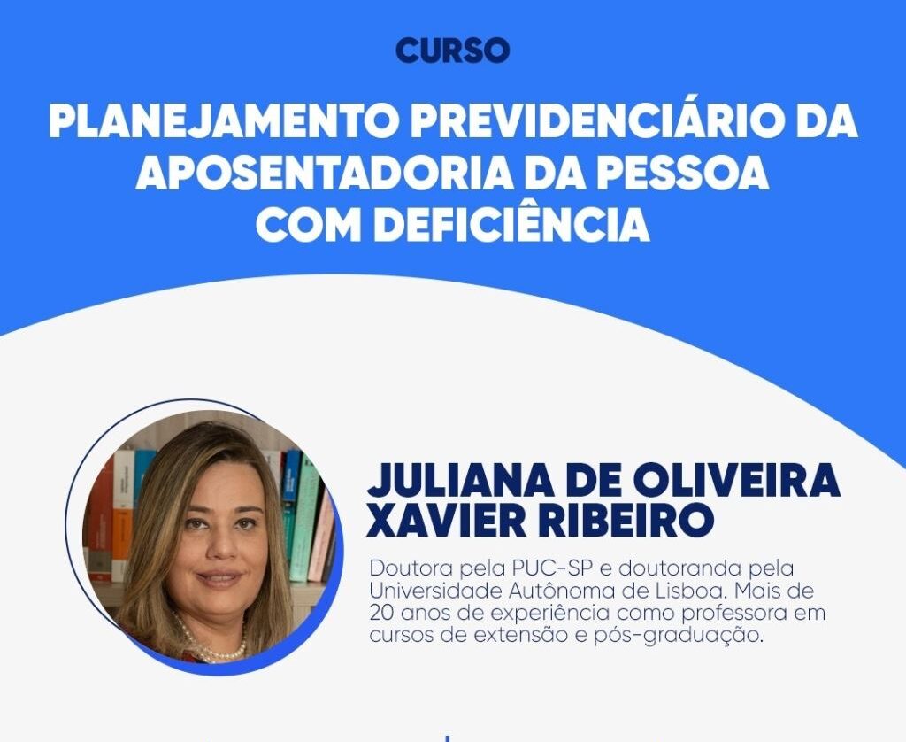 O curso Planejamento Previdenciário da Aposentadoria da Pessoa com Deficiência acontecerá, em Cuiabá, no auditório da ESA-MT, dia 14, a partir das 18h. A palestrante, Juliana Ribeiro, é doutora pela PUC-SP e doutoranda pela Universidade Autônoma de Lisboa, coordenadora de cursos de pós-graduação em Direito Previdenciário, autora de mais de 10 livros publicados e tem mais de 20 anos de experiência como professora em cursos de extensão e pós-graduação.