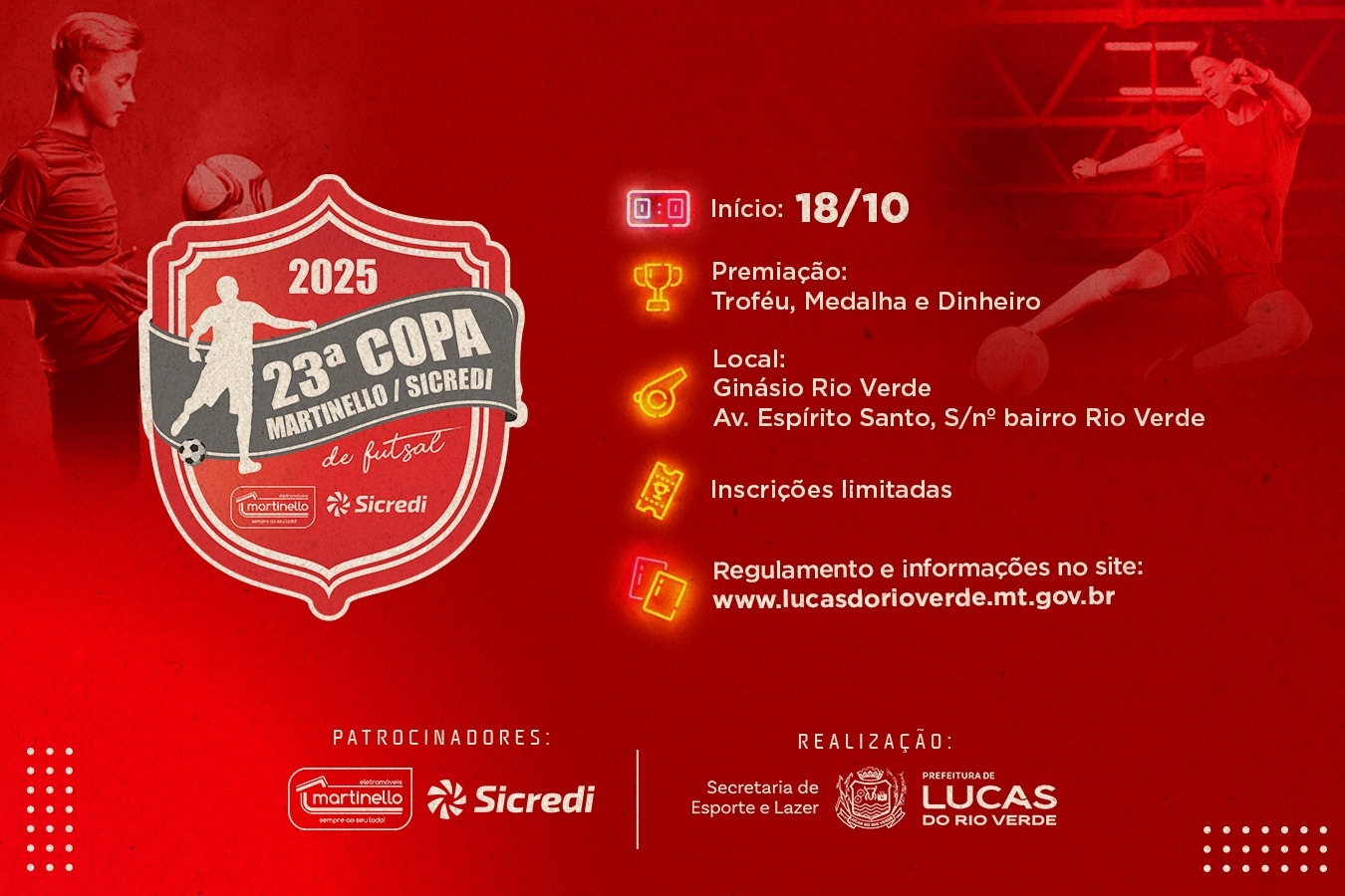 A 23ª edição da Copa Martinello/Sicredi de Futsal terá início neste sábado (18), a partir das 19h, no Ginásio Rio Verde. A competição, uma das mais tradicionais do esporte amador em Lucas do Rio Verde, contará com 156 equipes inscritas e mais de 200 jogos programados.