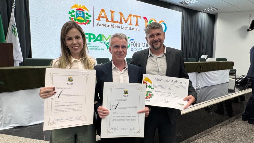 Na noite desta terça-feira (21/10), em Cuiabá, diretores da Associação dos Produtores de Sementes de Mato Grosso (Aprosmat), em sessão de homenagens promovida pelo deputado estadual, Dilmar Dal´ Bosco, agraciou com títulos de cidadão mato-grossense, o presidente da Aprosmat, Nelson Croda e a vice-presidente institucional da associação, Patrícia Brunetta.