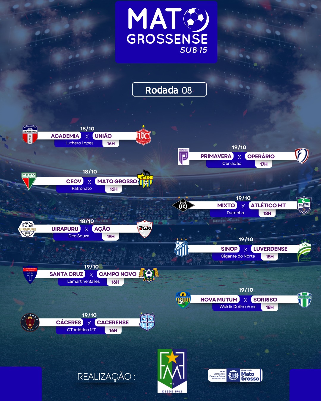A reta final da fase classificatória do Campeonato Mato-grossense Sub-15 promete grandes duelos neste fim de semana. A 8ª rodada, que será disputada no sábado (18) e no domingo (19), coloca frente a frente equipes que brigam diretamente por posições no topo da tabela.