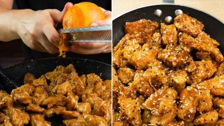 5. Acrescente o frango empanado na frigideira com o glaze ainda quente. Finalize com as raspas de laranja, cebolinha picada e sementes de gergelim torrado. Sirva com arroz branco.