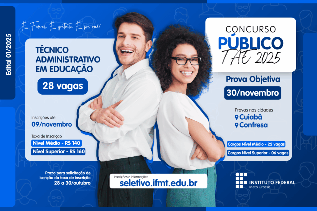 O Instituto Federal de Educação, Ciência e Tecnologia de Mato Grosso (IFMT) publicou o Edital nº 01/2025, abrindo inscrições para o seu Concurso Público destinado ao provimento de 28 vagas efetivas na carreira de Técnico Administrativo em Educação (TAE).