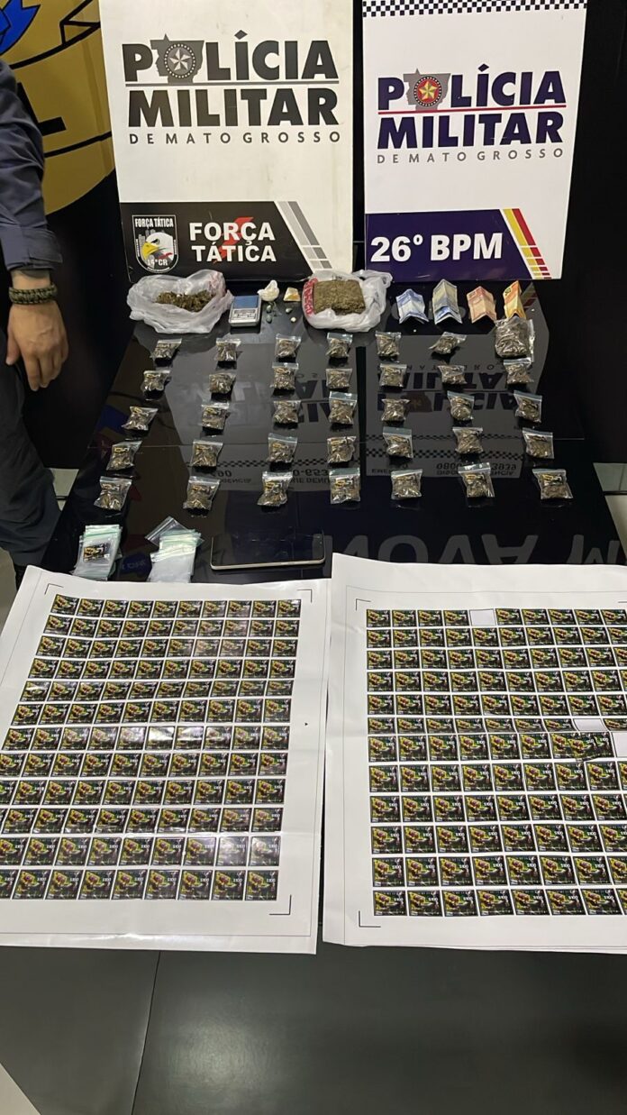 Com a autorização do suspeito, os policiais entraram no imóvel e localizaram diversas porções de entorpecentes, invólucros plásticos usados para embalagem, adesivos com inscrições ligadas a facções criminosas, cartelas com indicações de valores (R$ 50 e R$ 100) e uma balança de precisão. Parte da droga já estava embalada e pronta para a venda.
