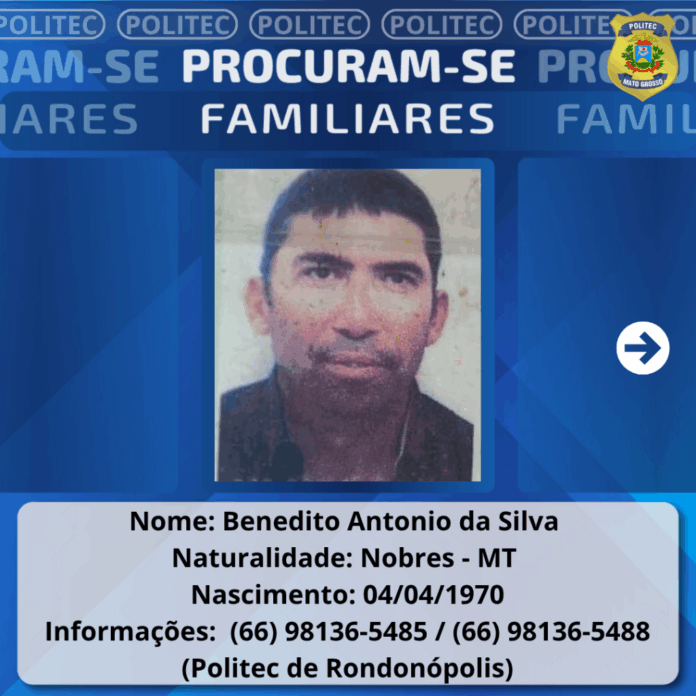 A Gerência de Medicina Legal da Perícia Oficial e Identificação Técnica (Politec) de Rondonópolis busca por familiares de um homem que foi encontrado morto em uma quitinete, nesta terça-feira (7.10), no bairro Vila Duarte, em Rondonópolis. Ele foi identificado como Benedito Antônio da Silva e tinha 54 anos.