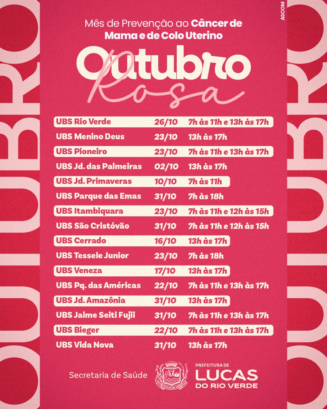 Durante o mês de outubro, a Prefeitura de Lucas do Rio Verde, por meio da Secretaria Municipal de Saúde, realiza uma programação especial voltada à prevenção e ao cuidado com a saúde da mulher.