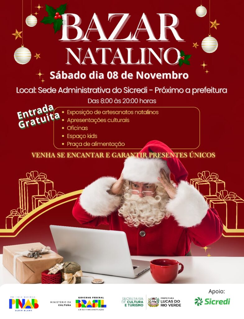 O 3º Bazar Natalino conta com o apoio do Sicredi, da Prefeitura de Lucas do Rio Verde, da Secretaria Municipal de Cultura e Turismo, e do Ministério da Cultura, por meio da Política Nacional Aldir Blanc (PNAB).